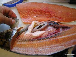 Aldrei hafa mér þótt myndir af fiski á aðgerðaborði vera smekklegar, en set þó eina slika inn. Fyrir því eru sérstakar ástæður, því fiskurinn reyndist einstakur og ýmislegt kom á óvart við aðgerðina…